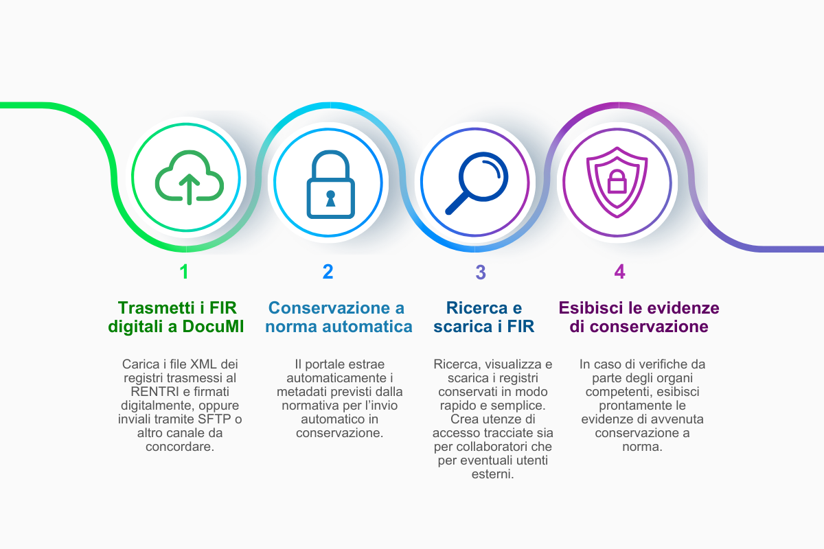 Con il servizio DocuMI puoi caricare i FIR digitali firmati sul portale online o trasmetterli tramite canale concordato. Il sistema estrae i metadati richiesti in automatico e avvia la conservazione digitale a norma, permettendo la ricerca, il download dei documenti e l’esibizione delle evidenze in caso di controlli.